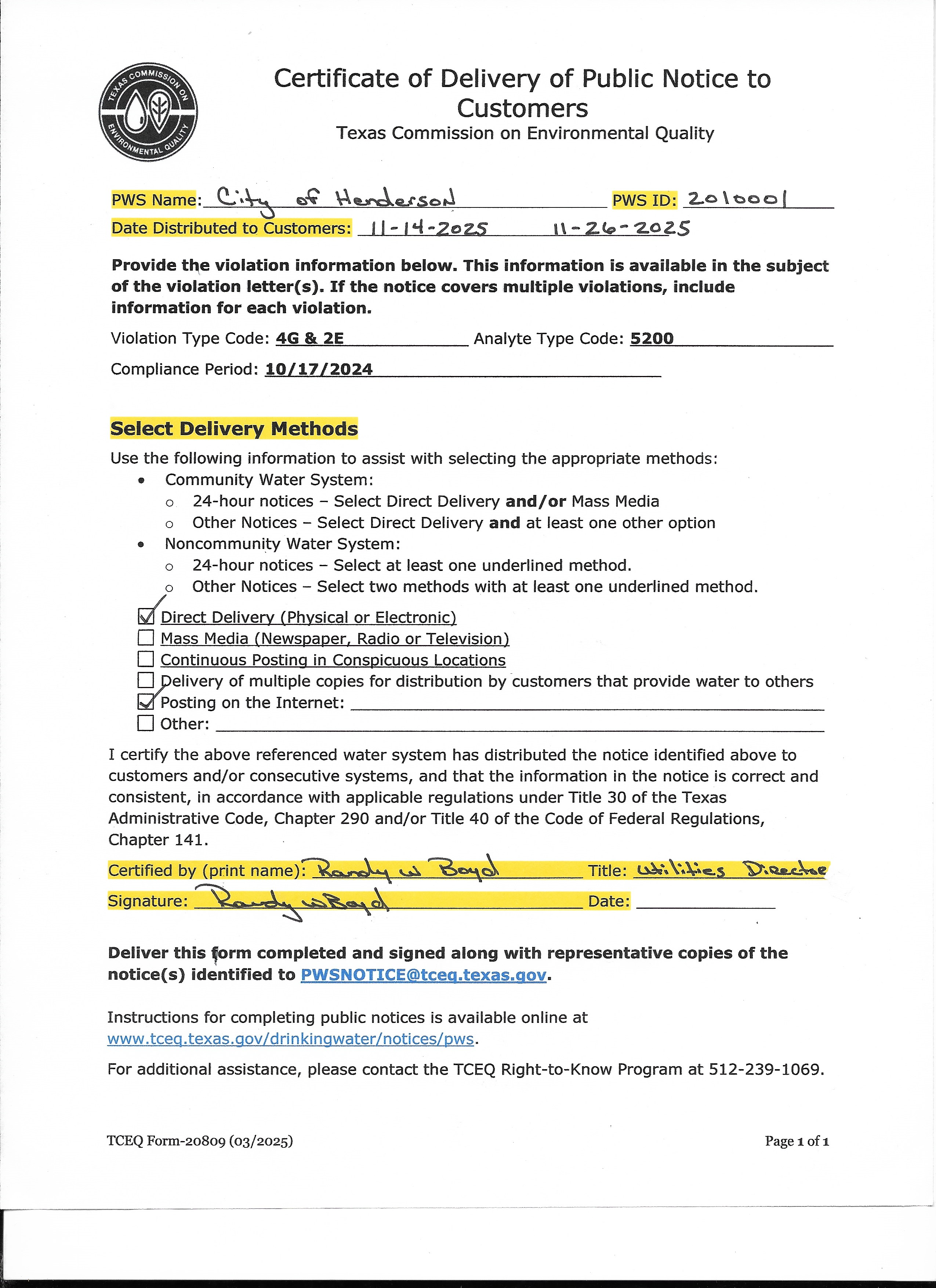 2025 Certificate of Delivery of Public Notice to Customers